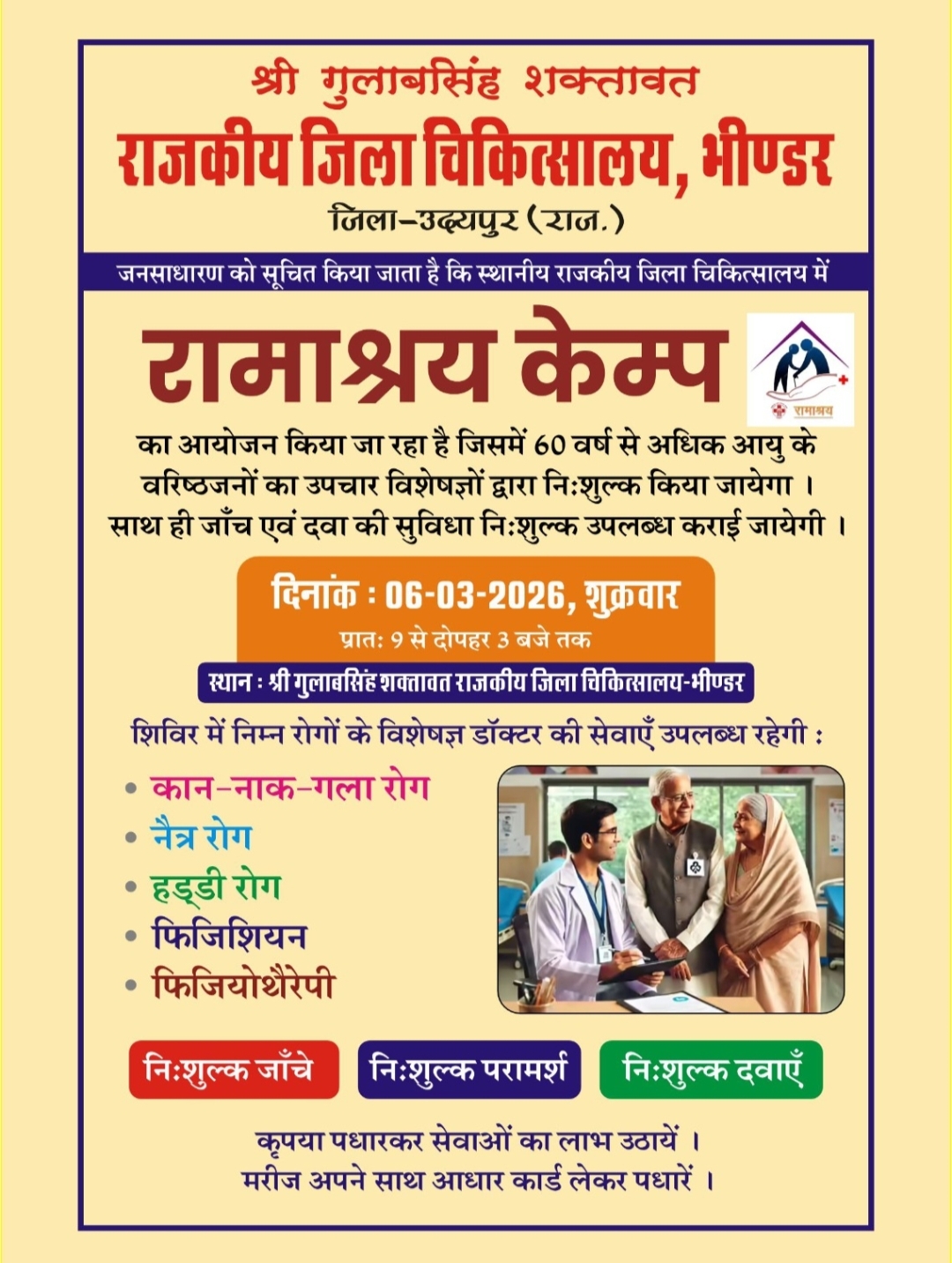 वल्लभनगर,(कन्हैया लाल मेनारिया बासड़ा)!भींडर स्थानीय श्री गुलाब सिंह शक्तावत राजकीय जिला चिकित्सालय भींडर में शुक्रवार को रामाश्रय स्वास्थ्य शिविर का आयोजन किया जाएगा।। जिसमे वरिष्ठ