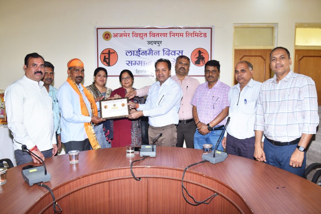उदयपुर, 4 मार्च। भारत सरकार एवं राजस्थान सरकार के दिशा-निर्देशानुसार एवं अजमेर विद्युत वितरण निगम लिमिटेड के प्रबन्ध निदेशक द्वारा जारी निर्देशों की अनुपालना में उदयपुर सर्किल के तत्वावधान में लाइनमैन दिवस सम्मान समारोह मंगलवार को पटेल सर्किल स्थित निगम सभागार में मनाया गया। संभागीय मुख्य अभियंता आई. आर. मीणा के नेतृत्व में कार्यालय सहायक अभियन्ता (पवस) खेरवाड़ा के तकनीशियन गब्बर सिंह व कार्यालय सहायक अभियन्ता (पवस) झाड़ोल के तकनीशियन हेमराज मीणा को निगम हित, उपभोक्ता संतुष्टि एवं बेहतर कार्यशैली के लिये वृत्त स्तर पर प्रशस्ति पत्र प्रदान कर सम्मानित किया गया। इसी क्रम में कार्यालय सहायक अभियन्ता (पवस) अंबामाता के तकनीशियन हनुमान सिंह मीणा को भारत सरकार के ऊर्जा विभाग द्वारा नई दिल्ली में आयोजित कार्यक्रम में सम्मानित किया गया।