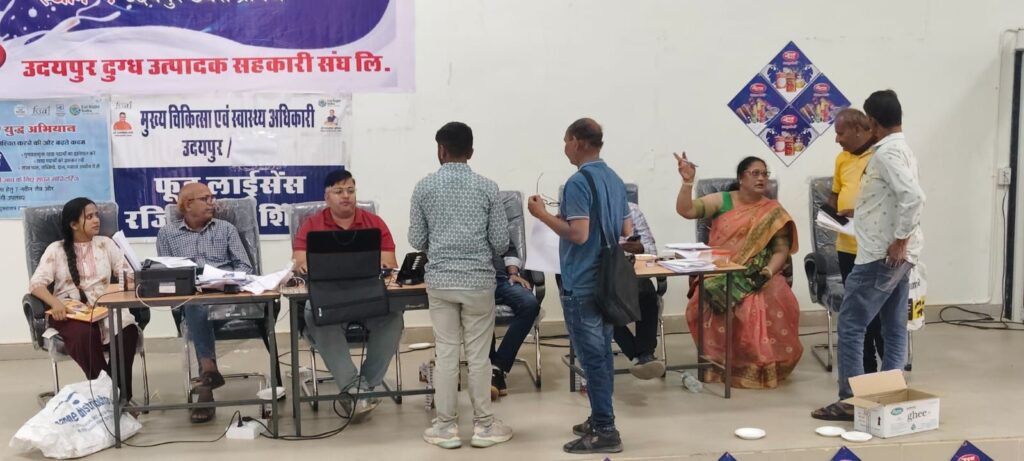 उदयपुर, 4 मार्च। उदयपुर दुग्ध उत्पादक सहकारी संघ एवं मुख्य चिकित्सा एवं स्वास्थ्य अधिकारी कार्यालय उदयपुर के संयुक्त तत्वाधान मे भारतीय खाद्य सुरक्षा और मानक अधिनियम के तहत फूड लाइसेन्स हेतु सरस डेयरी परिसर मे पंजीयन शिविर आयोजित हुआ।