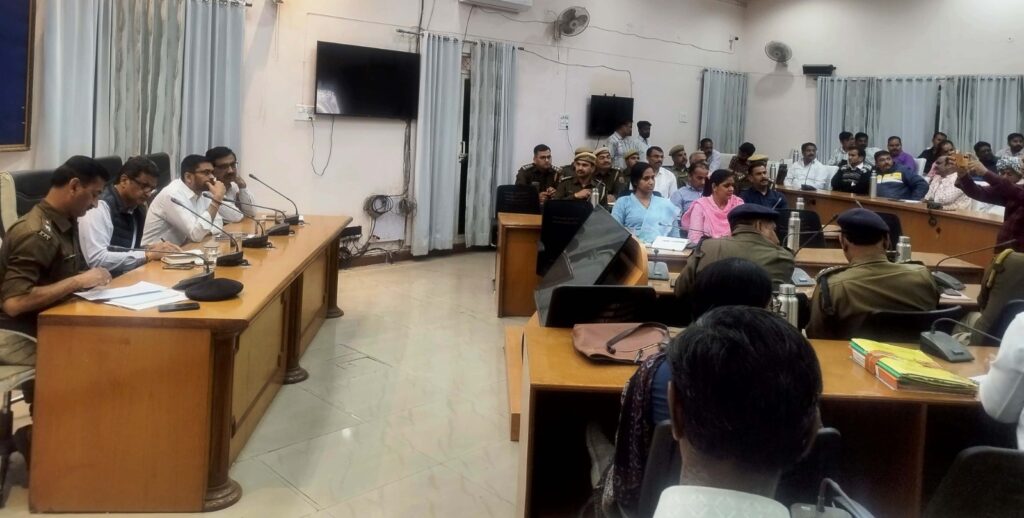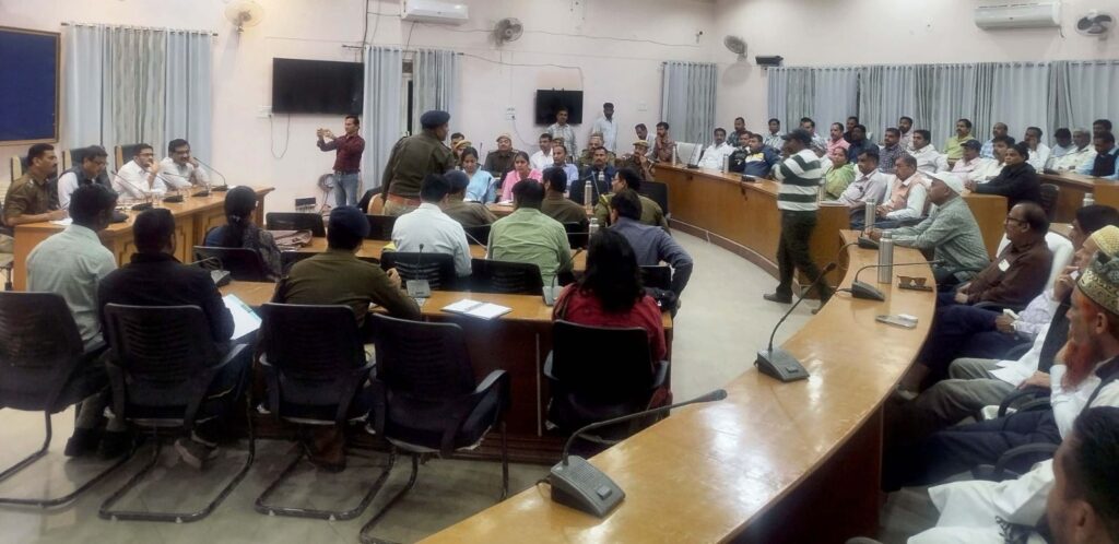जिला शांति समिति की बैठक में चर्चा करते विभिन्न समुदायों समाज के प्रतिनिधि एवं शांति समिति के सदस्य व पुलिस एवं प्रशासनिक अधिकारीगण।