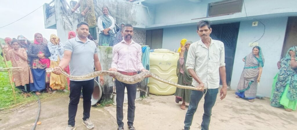 खैरवाड़ा (धरणेन्द्र जैन)। ग्राम पंचायत भाटकी में आज प्रात 10 बजे रमेश अहारी ननमपारा के घर के बाहर 7 फीट लंबा अजगर निकलने से घर वालों में दहशत फैल गई। घर के लोगों ने तुरंत वर्तमान शिक्षक और पूर्व वनकर्मी मनीष गरासिया को फोन करके सूचना दी। मनीष ने वन कर्मी शंभू लाल और दोनों ने मिलकर अजगर को रेस्क्यू कर जावली के जंगलों में छोड़ दिया। सूचना गांव के प्रमुख मुखी परेश पटेल ने दी।