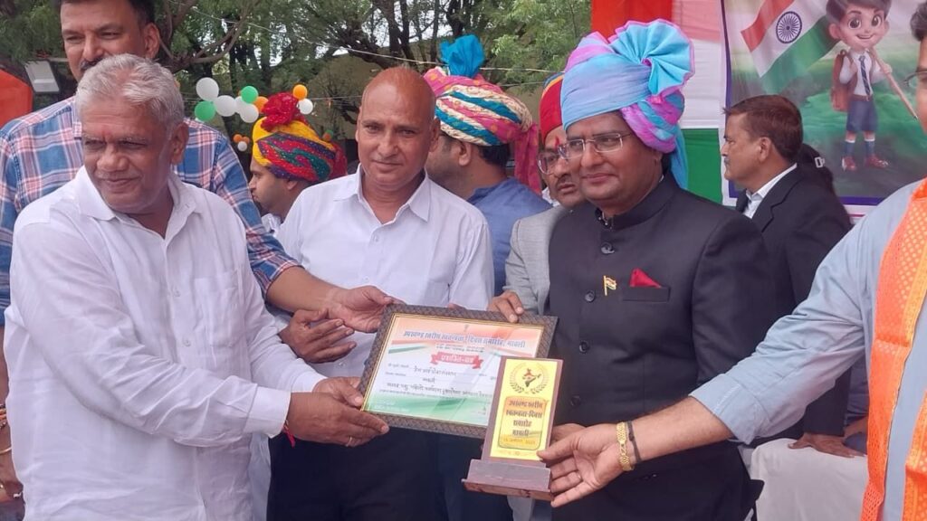 मावली (नरेन्द्र त्रिपाठी)!मावली उपखंड स्तर पर आयोजित स्वतंत्रता दिवस समारोह के अवसर पर प्रेम सांई सेवा संस्थान, मावली को मानव सेवा, पशु-पक्षियों की देखभाल एवं पर्यावरण संरक्षण के क्षेत्र में उल्लेखनीय योगदान हेतु मावली उपखंड अधिकारी द्वारा सम्मानित किया गया इस दोरान संस्थान अध्यक्ष मदनलाल माहेश्वरी, उपाध्यक्ष प्रवीण राज संगावत, सचिव केशवजी आमेटा उपस्थित रहे।