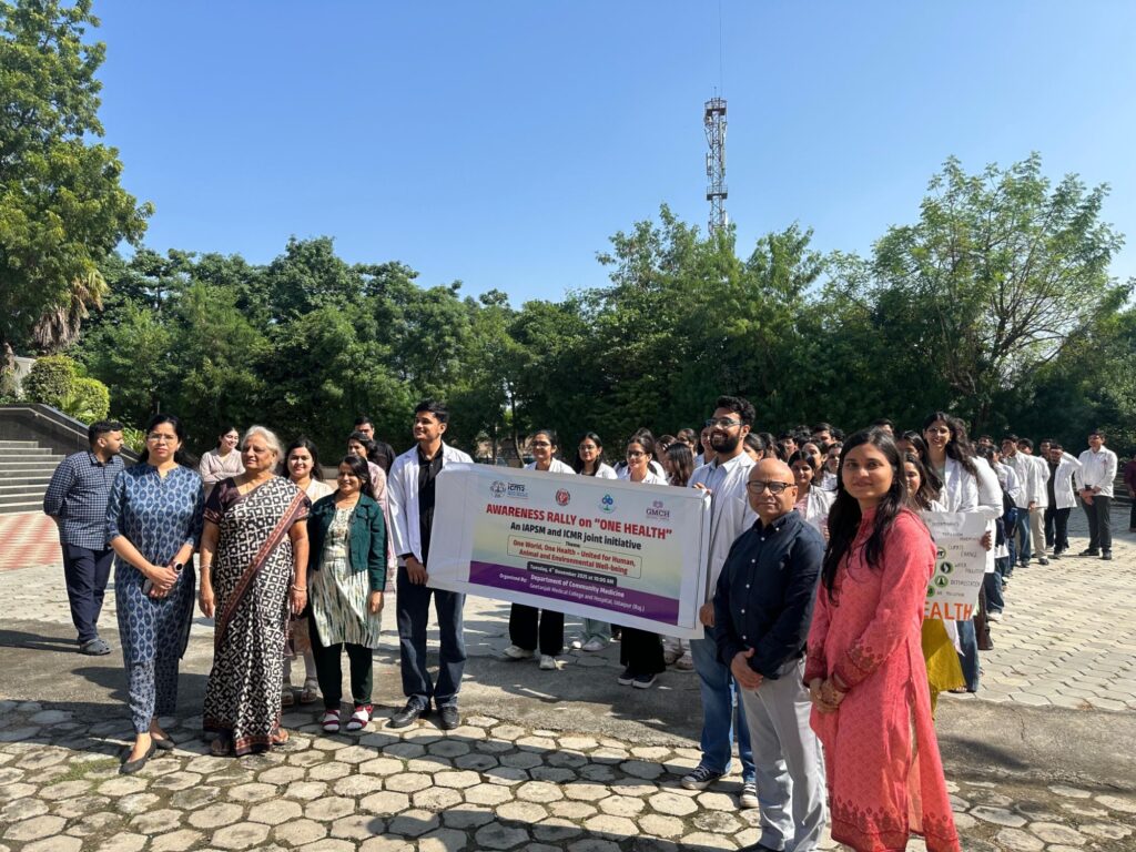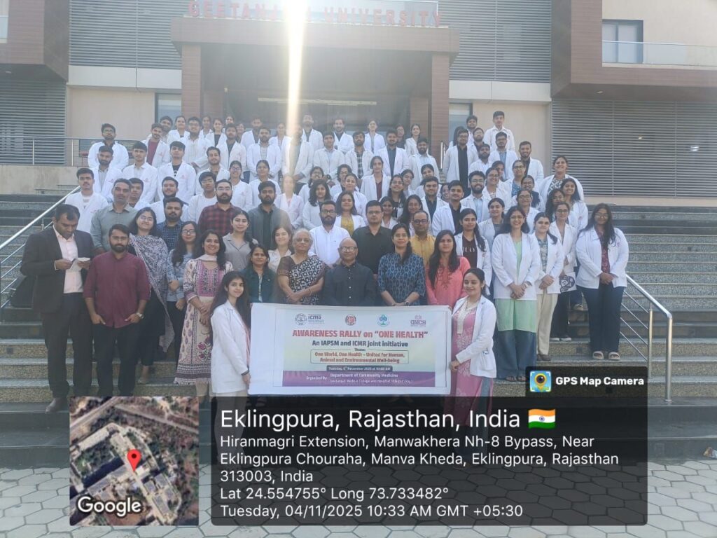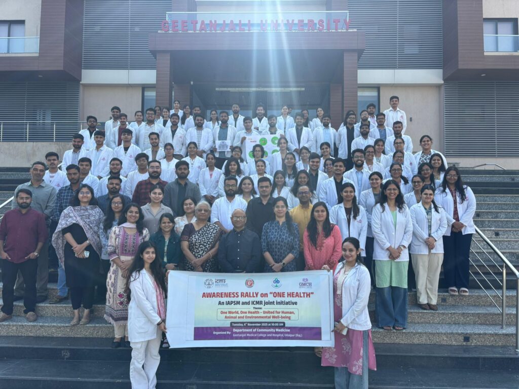 उदयपुर, नरेन्द्र त्रिपाठी)!गीतांजलि मेडिकल कॉलेज एंड हॉस्पिटल ने आज इंडियन एसोसिएशन ऑफ प्रिवेंटिव एंड सोशल मेडिसिन के तत्वाधान में और भारतीय आयर्वितान अनुसंधान परिपद “के सहयोग से ‘एक स्वास्थ्य’ की अवधारणा पर एक जागरूकता रैली का सफलतापूर्वक आयोजन किया। इस पहल का विषय था “एक विश्व, एक स्वास्थ्य – मानव, पशु और पर्यावरण कल्याण के लिए एकजुट”।