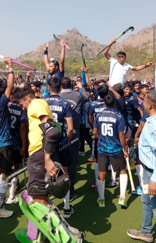 मैच की समाप्ति के बाद सैकड़ो दर्शक मैदान में दौड़ पड़े और राजस्थान के खिलाड़ियों, राजस्थान टीम के प्रशिक्षक दिग्विजय सिंह राणावत राजस्थान इनके चीफ डे मिशन डॉ गोविंद सिंह राठौड़ एवं मैनेजर बलवंत चौधरी एवं शिक्षा विभाग के आयोजक अधिकारियों को अपने कंधों पर उठा लिया और भारत माता की जय के नारे लगाते हुए जश्न में डूबते हुए खेल मैदान पर खूब नाचे। टीम के सभी खिलाड़ियों ने स्वर्णिम जीत पर अपने कोच दिग्विजय सिंह राणावत फतह स्कूल प्रधानाचार्य गजेंद्र आवोत , टीम के चीफ डे मिशन डॉ गोविंद सिंह राठौड़ सहित शिक्षा अधिकारियों के पैर छुकर आशीर्वाद लिया। फिर जीत की खुशी में पूरे हॉकी ग्राउंड का दौड़कर एक चक्कर लगाया व म्यूजिक पर खूब नाचे। खिलाड़ियों के साथ दर्शक, प्रशिक्षक हॉकी प्रेमी,आयोजक व शिक्षा अधिकारी भी झूम उठे।