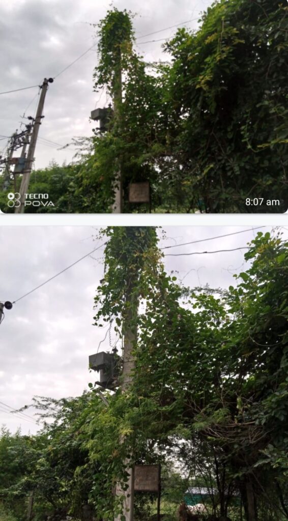 कांटे ,विलायती बबुल, झाड़ियों, बैल आदि ने केबल तार, खंभे व डिपी को झकड़ लिया है। किसी भी समय हादसा होने की आशंका है । गाँव का मुख्य रास्ता होने के कारण मवेशी, भी आते जाते हैं। स्कूल में जाने वाले विद्यार्थियों व आम लोगों के लिए भी आये दिन हादसे की संभावना है।