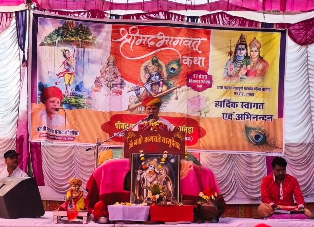 वल्लभनगर , (कन्हैया लाल मेनारिया बासड़ा)!बांसड़ा में सात दिवसीय श्रीमद् भागवत कथा बांसड़ा विधानसभा क्षेत्र के बांसड़ा में भागवत सेवा समिति बांसड़ा एवं ग्रामवासियों के संयुक्त तत्वावधान में मंशापूर्ण महादेव मंदिर परिसर में सात दिवसीय श्रीमद् भागवत कथा ज्ञानयज्ञ का आयोजन भक्तिमय वातावरण में जारी है। कथा के दूसरे दिन मंदिर परिसर में श्रीकृष्ण भक्ति, हरिनाम संकीर्तन और भक्ति गीतों की मधुर स्वर लहरियों से माहौल भक्तिरस में डूब गया। कथा व्यास उज्जैन स्थित गोकुलधाम आश्रम के संत शिरोमणि नारायण प्रसाद ओझा ने श्रीमद् भागवत महापुराण के गूढ़ रहस्यों को सरल एवं भावपूर्ण शब्दों में प्रस्तुत किया। उन्होंने पांडव धर्मराज युधिष्ठिर और महाबली अर्जुन के जीवन प्रसंगों का वर्णन करते हुए कहा कि समय पर जो प्राप्त हो, उसी में संतोष करना सच्चा सुख है। संत ओझा ने कहा कि मनुष्य का वास्तविक कल्याण भगवान की शरण में जाने से ही संभव है। उन्होंने कलयुग का वर्णन करते हुए राजा परीक्षित की कथा का भावपूर्ण वाचन किया और बताया कि कलयुग में भी भगवत नाम-स्मरण और सत्संग से जीवन सफल बनाया जा सकता है। कथा के दौरान भगवान श्रीकृष्ण की लीलाओं का वर्णन होते ही श्रद्धालु भक्ति गीतों पर झूम उठे। ‘नंद के आनंद भयो’ और ‘गोविंद बोलो हरि गोपाल बोलो’ जैसे भजनों पर पूरा परिसर भक्तिरस में मग्न हो गया।