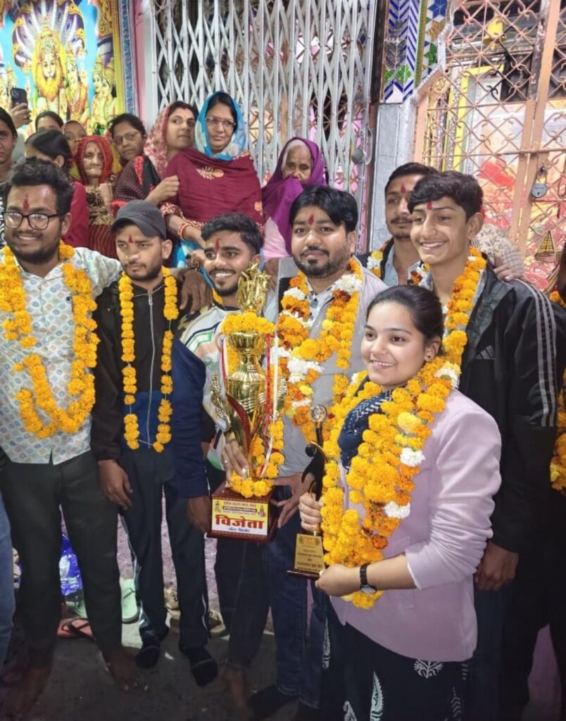 वल्लभनगर, (कन्हैया लाल मेनारिया बासड़ा)!नीमड़ी में आयोजित मेवाड़ चौबीसा ब्राह्मण समाज की 8 वी खेलकूद प्रतियोगिता में क्रिकेट में फाइनल मैच में नीमड़ी को 9 विकेट से हराकर जीतने पर नृसिंह क्लब भींडर का स्थानीय समाजजनों ने पलक पावड़े बिछाकर ढोल नगाड़ों के साथ विजय जुलूस निकाला,महादेव मंदिर पर सभी चौबिसा समाज जन इकट्ठे होकर क्रिकेट की विजेता टीम को तिलक और माला पहनाकर स्वागत किया साथ ही वाद विवाद प्रतियोगिया में प्रथम रहे पंकज कुमार चौबीसा, राज्य स्तर पर युवा महोत्सव में पूरे राजस्थान में प्रथम आने पर पूजा वेनावत और मोहित व्यास का अभिनंदन किया गया,मोहित के प्रवास पर होने के कारण उनके पिता श्री भरत व्यास का समाजजनों ने स्वागत किया, साथ ही जिला चिकित्सालय में डायलसिस नर्सिंग ऑफिसर पद पर कार्यग्रहण करने पर विकास धर्मावत का भी स्वागत किया गया,सभी विजेताओं को जुलूस के रूप में नाचते गाते रास्ते मे पुष्प वर्षा करते हुए भिन्डेश्वर महादेव मंदिर से सूरजपोल होते हुए नृसिंह मंदिर ,मुरलीधर मंदिर,सदर बाजार ,रावली पोल, चारभुजानाथ मंदिर होते हुए पुनः नृसिंह मंदिर पहुँचे,इस अवसर पर समाज के कन्हैया लाल देशबन्धु,कैलाश मन्दावत,हरि प्रसाद धर्मावत,किशन लाल व्यास,मदन भोजावत,चेतन प्रकाश धर्मावत, ओम प्रकाश मन्दावत,गोपाल विजावत(विजय सेनेट्री),मुकेश धर्मावत,प्रकाश भोजावत,पवन विजावत,सुभाष व्यास,बंशी लाल विजावत, जगदीश भोजावत,आशीष बन्धु चौबिसा,राजेन्द्र वेनावत, बद्री लाल वेनावत,देवी लाल भोजावत,दिनेश पण्ड्या, दिनेश व्यास,जगदीश वेनावत,अशोक धर्मावत ,दिनेश भट्ट सहित महिलाओं और बच्चो ने भाग लिया,साथ ही मुरलीधर मन्दिर पर आयोजित सूक्ष्म चौपाल पर खिलाड़ियों की सुविधाओं को ध्यान में रखते हुए खेल मैदान की व्यवस्था और आगामी वर्षो में चौबीसा समाज भींडर के तत्वावधान में टूर्नामेंट करवाने का फैसला लिया गया।।