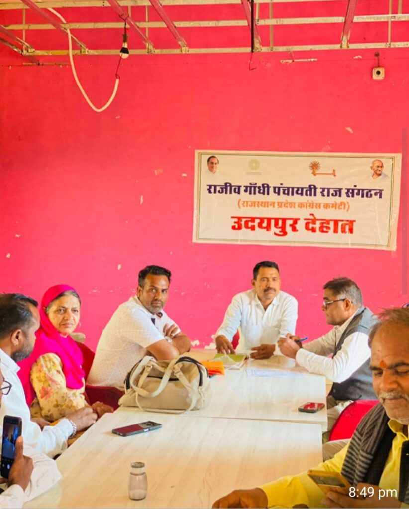 वल्लभनगर, (कन्हैया लाल मेनारिया बासड़ा)!राजीव गांधी पंचायत राज संगठन के देहात जिला उदयपुर की कार्यसमिति की बैठक संभाग प्रभारी धीरज कुमार डामोर प्रदेश महासचिव पंचायत राज संगठन के मुख्य आतिथ्य एंव देहात जिलाध्यक्ष माधव लाल अहीर की अध्यक्षता मे भटेवर एक होटल में आयोजित हुई जिसमे आने वाले पंचायत राज चुनावों को लेकर, संगठन के आगामी क्रार्यक्रमों को चर्चा की गई एंव जयपुर के बिरला आडिटोरियम में आयोजित पंचायत राज सशक्तिकरण सम्मेलन मे ज्यादा से ज्यादा सहभागिता पर मंथन हुआ साथ ही नरेगा बचाओ महासग्राम के तहत राजीव गांधी पंचायतीराज संघटन के तहत भी गांवों में पदयात्रा निकालने का निर्णय लिया गया ।। क्रार्यक्रम में जिलाप्रभारी नजमा मेवाफरोश, जिला उपाध्यक्ष भेरूलाल गुर्जर, विधानसभा समन्वयक डाल चन्द नागदा, पंचायत राज के ब्लॉक उपाध्यक्ष राजकुमार गुर्जर, महेन्द्र सिंह, गोपी लाल गाडरी, ब्लॉक महासचिव कैलाश डांगी, खेमली ब्लॉक कोमल मेघवाल, गिर्वा ब्लॉक अध्यक्ष दौलत राम मीणा, ब्लॉक सचिव सत्यनारायण लोहार, सवाई लाल, जिला सचिव वरदी चंद डांगी, युथ ब्लॉक अध्यक्ष लक्ष्मण डांगी,मोहन भील, ललित व्यास नवानियां सहित समस्त पंचायत राज संगठन के पदाधिकारी मौजूद थे।