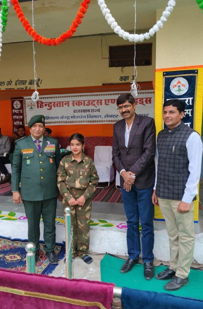 उदयपुर, (कन्हैया लाल मेनारिया बासड़ा),27 जनवरी। 77 वें गणतंत्र दिवस पर हिंदुस्तान स्काउट एंड गाइड राजस्थान राज्य द्वारा राज्य मुख्यालय की ओर से सोमवार सांय को गोवर्धन विलास सेक्टर 14 उदयपुर स्थित राज्य प्रशिक्षण केंद्र में सांस्कृतिक संध्या का आयोजन किया गया । इस अवसर पर मुख्य अतिथि हिंदुस्तान स्काउट एंड गाइड के जिला अध्यक्ष व एच एस जी की राज्य स्तरीय भवन निर्माण एवं विकास समिति के चेयरमैन नरेंद्र सिंह राणावत थे। कार्यक्रम के अध्यक्षता हिंदुस्तान स्काउट एंड गाइड राजस्थान राज्य के राज्य सचिव नरेंद्र ऑदिच्य ने की। विशिष्ट अतिथि भारतीय जनता पार्टी के शहर जिला मीडिया प्रभारी अशोक नागदा व हिंदुस्तान स्काउट एंड गाइड राजस्थान राज्य के राज्य संगठन आयुक्त आर डी गिल,स्टेट ट्रेनिंग कमिश्नर प्रदीप मेघवाल ,संभाग आयुक्त गोपाल मेहता मेनारिया, जिला ट्रेनिंग कमिश्नर मुकेश कुमार अहीर, जिला सचिव रमा जैन थे। सांस्कृतिक संध्या में स्काउट एंड गाइड के विभिन्न पदाधिकारी, स्काउट गाइड दलों गोवर्धन विलास क्षेत्र के अनेक कॉलोनी वासियों,जनप्रतिनिधियों,बच्चों व महिलाओं ने भाग लिया। सभी अतिथियों को तिलक व पुष्प वर्षा से स्वागत करते हुए गार्ड ऑफ ऑनर दिया गया । सांय 4 बजे राज्य सचिव नरेंद्र ऑदिच्य ने राष्ट्रध्वज (तिरंगा) फहराकर सांस्कृतिक संध्या का शुभारंभ किया । राष्ट्रगान के बाद संगठन से पंजीकृत जिले के विभिन्न स्कूलों से आए स्काउट एंड गाइड बालक बालिकाओं द्वारा एक से बढ़कर एक भव्य देश भक्ति से ओतप्रोत गीत , ऑपरेशन सिंदूर एवम राजस्थानी लोक नृत्यों पर आधारित सांस्कृतिक प्रस्तुतियां पेश की गई। लव कुश उच्च प्राथमिक विद्यालय भटेवर, बाल विनय स्कूल रामपुरा, नागफणी कॉलेज खेरवाड़ा, मेवाड़ पब्लिक स्कूल मीठा नीम, चाइल्ड पेराडाइस मेड़ता व अन्य विद्यालय के बालको ने शानदार सांस्कृतिक प्रस्तुतियां पेश कर खूब तालियां बटोरी।