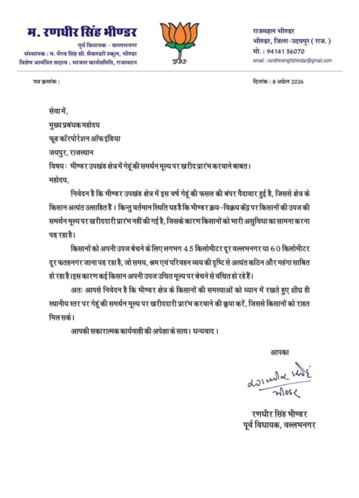 भींडर, (कन्हैया लाल मेनारिया बासड़ा)। वल्लभनगर के पूर्व विधायक रणधीर सिंह भीण्डर ने भीण्डर उपखंड क्षेत्र में गेहूं की फसल की खरीद को लेकर गंभीर चिंता जताई है। उन्होंने खाद्य निगम जयपुर के मुख्य प्रबंधक को पत्र लिखकर क्षेत्र में समर्थन मूल्य पर खरीद जल्द शुरू कराने की मांग की है। पत्र में उन्होंने बताया कि इस वर्ष भीण्डर उपखंड क्षेत्र में गेहूं की फसल का उत्पादन बंपर हुआ है, जिससे क्षेत्र के किसान काफी उत्साहित हैं। लेकिन इसके विपरीत स्थिति यह है कि भीण्डर के क्रय-विक्रय केंद्र पर अभी तक समर्थन मूल्य पर गेहूं की खरीद शुरू नहीं की गई है। इस कारण किसानों को अपनी उपज बेचने में भारी परेशानी का सामना करना पड़ रहा है।
