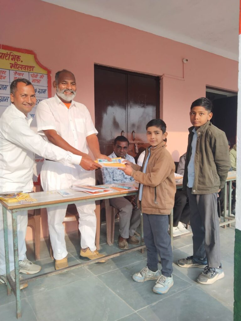 कंचन इंडिया लिमिटेड के चैयरमैन लादूलाल बांगड तथा अमित कुमार के सहयोग से विधालय में अध्ययनरत सौ बालक बालिकाओं को कापी रबर पैंसिल तथा पैन पुर्व सरपंच मोहन लाल गुर्जर के द्वारा वितरित किए गए हैं!