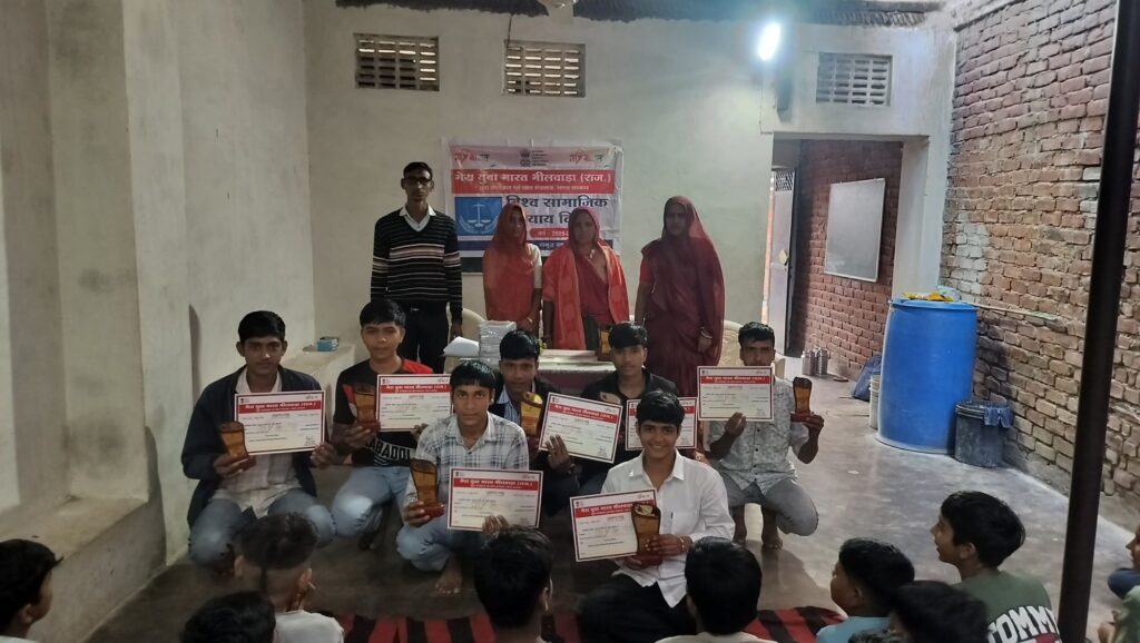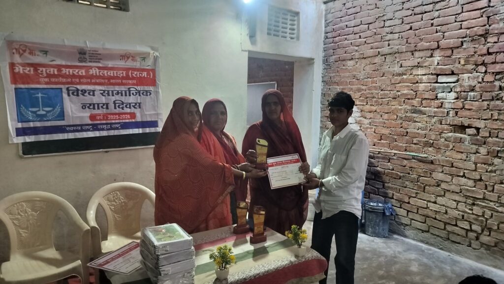 भीलवाड़ा ,(जय प्रकाश शर्मा),बनेड़ा !उपखण्ड सर्किल के लापिया गांव में शुक्रवार को नवगठित नेहरु युवा महिला मंडल ने देवनारायण कोचिंग सेटर में माय भारत नेहरू युवा केन्द्र की तरफ से विश्व सामाजिक न्याय दिवस मनाया गया। कार्यक्रम के वाद विवाद निबंध चित्रकला तथा मेहंदी प्रतियोगिताओं का आयोजन किया गया। प्रतियोगिताओं के विजेताओ को आयोजन कमेटी की और से माइ भारत का सर्टिफिकेट व शिल्ड देकर सम्मानित किया गया।