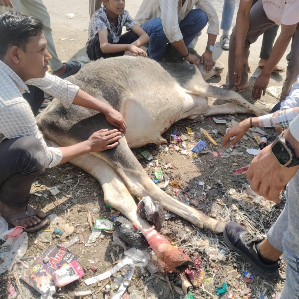 भीलवाड़ा ,( जय प्रकाश शर्मा)!बनेड़ा उपखण्ड मुख्यालय स्थित पथवारी चौराहे के पास बुधवार को अज्ञात वाहन की टक्कर से गाय का बछड़ा घायल हो गया। लहुलुहान बछड़े की सुचना पर आसपास के दुकानदार मौके पर पहुंचे। 1962 पर कॉल कर पशु चिकित्सा मोबाइल एम्बुलेंस को सुचना दी। जिसके बाद मौके पर पहुची मोबाइल एम्बुलेंस के स्टाफ द्वारा लोगों कि सहायता से घायल बछड़े का प्राथमिक उपचार किया गया। साथ सरदार नगर ग्राम स्थित सोमनाथ गोशाला की मोके पर एम्बुलेंस की मदद से घायल बछड़े को सोमनाथ गो शाला पहुंचाया गया।