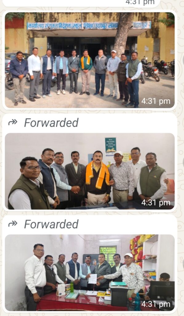 मावली! मावली कस्बे से राजस्थान शिक्षक संघ (अंबेडकर) के प्रदेश सरंक्षक एवं सलाहकार पूर्व प्रदेश महामंत्री सुरेश कुमार देशबंधु के नेतृत्व में प्रतिनिधि मंडल द्वारा संयुक्त निदेशक स्कूल शिक्षा उदयपुर संभाग जिला उदयपुर के अतिरिक्त जिला शिक्षा अधिकारी को मेवाड़ी पगड़ी ऊपरना ओढ़ा कर स्वागत अभिनंदन किया गया साथ ही उदयपुर संभाग के अध्यक्ष वाल जी अड संभाग महामंत्री ओम प्रकाश मेघवाल के सानिध्य में संघ द्वारा विभिन्न समस्याओं पर चर्चा करते हुए अवगत करवाया गया जिसमें रोस्टर रजिस्टर संधारण कर बैकलॉग भरा जाए , डीपीसी सभी वर्ग कि समय पर की जाए ,एसीपी प्रकरण बकाया ,और वर्तमान में कुछ समय पूर्व पी डी हेड के कार्मिकों का पेमैनेजर अपडेट नहीं होने से ए सी पी, एरियर, डी ए एरियर, पी एल सरेंडर का ऑपशन पे मेनेजर पर नहीं आ रहा इसका समाधान किया जाए ,सभी विद्यालयों में सभी महान पुरुषों की तस्वीर को अनिवार्य रूप से लगाई जाए ! सभी वर्ग के विद्यार्थियों की छात्रवृत्ति महंगाई के दौर में बढ़ा कर समय पर छात्रवृत्ति दी जाए मिड डे मील की राशि विगत कई महीनों से बकाया हैं उसकी राशि खाते में तुरंत डाली जाए इन सभी समस्याओं का मांग पत्र अतिरिक्त सहायक निदेशक चंद्र कुमार जावरिया ललित कुमार बुनकर अतिरिक्त जिला शिक्षा अधिकारी हरिश्चंद्र पालीवाल संस्थापन अधिकारी को ज्ञापन सौंपा गया इस दौरान प्रदेश शिक्षक नेता सुरेश कुमार देशबंधु संभाग अध्यक्ष वालजी अड संभाग महामंत्री ओम प्रकाश मेघवाल जिला महामंत्री मणि लाल यादव,दिनेश कुमार चरपोटा शांतिलाल खराड़ी,रामलाल मईडा, प्रभुलाल सिंगाड़ाआदि कार्यकारणी के शिक्षक सदस्य उपस्थित रहे !