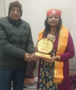 मेवाड़ के प्रसिद्ध साहित्यकार एवम सेवानिवृत प्राचार्य बसंत कुमार त्रिपाठी ने डा अलका पांडे का सम्मान मेवाड़ी पगड़ी ,उपरना एवम प्रतीक चिन्ह भेंट कर युग सेवा श्री सम्मान से सम्मानित किया।