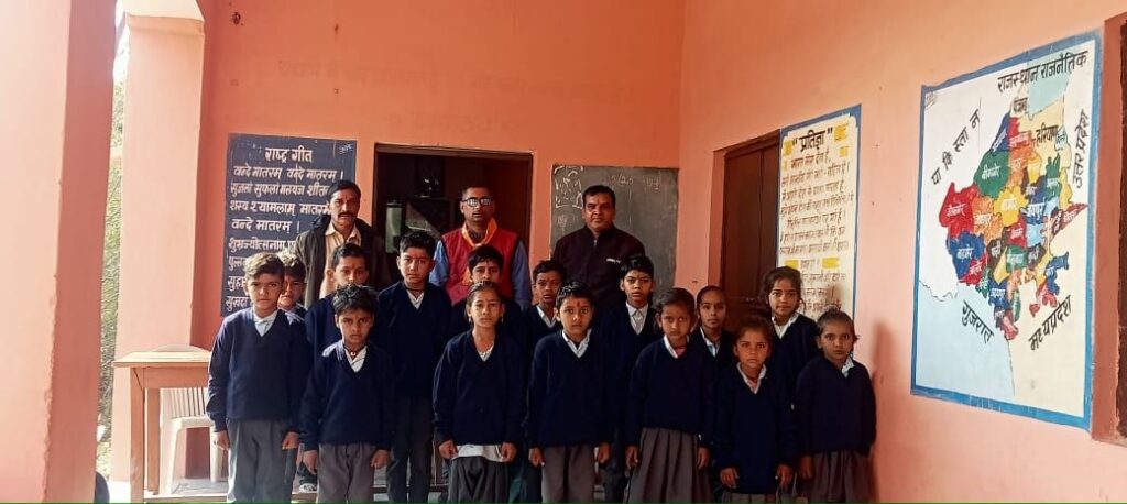 मावली, (नरेन्द्र त्रिपाठी)!मावली उपखंड के साकरोदा पीईईओ क्षेत्र के अंतर्गत राजकीय प्राथमिक विद्यालय नयाघर में राजस्थान शिक्षक संघ राष्ट्रीय के उपशाखा उपाध्यक्ष पुरुषोत्तम शर्मा (अध्यापक) द्वारा स्थानीय संस्था प्रधान श्री दिनेश जी कीर के आग्रह पर विद्यालय पहुंचकर नन्हे -मुन्ने छात्र-छात्राओं को गर्म स्वेटर वितरित किए व शिक्षक को सदैव नर सेवा व समाज सेवा में निरंतर निस्वार्थ भाव से काम करने की बात कही, तथा शिक्षण को व्यवसाय नहीं मानकर एक प्रभु द्वारा नियुक्त समर्पित सेवा कार्यो का वाहक बताया व समाज निर्माण का मुख्य कर्णधार बताया! इस दौरान विद्यालय संस्था प्रधान श्री दिनेश जी कीर ने भी छात्र छात्राओं हेतु उनके द्वारा किये जा रहे प्रयासों के बारे में अवगत करवाया! तथा श्री शर्मा का इस पुनीत कार्य के लिए आभार व्यक्त किया! इस दौरान साथी अध्यापक श्री गुलाब भी मौजूद रहे !