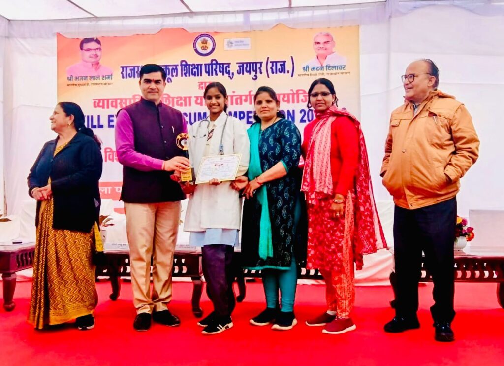 मावली ,( नरेन्द्र त्रिपाठी)!राजकीय बालिका उच्च माध्यमिक विद्यालय मावली गाँव की छात्रा डिंपल माथुर पुत्री प्रकाश माथुर ने राज्य स्तरीय व्यावसायिक शिक्षा अंतर्गत स्किल एक्जीबिशन कम कम्पिटिशन 2025-26 में द्वितीय स्थान प्राप्त कर विद्यालय, क़स्बे और ज़िले का नाम रोशन किया है। विद्यालय के प्रधानाचार्य रोशनलाल माखीजा ने बताया कि जिला स्तर पर प्रथम स्थान प्राप्त कर जयपुर में आयोजित प्रतियोगिता में भाग लेकर प्रदेश के विभिन्न ज़िलों से आए विद्यार्थियों के बीच अपने मॉडल से सम्बंधित विषय वस्तु को प्रभावी और आत्मविश्वास के साथ प्रस्तुत किया जिसे निर्णायकों द्वारा सराहा गया और द्वितीय स्थान प्राप्त किया।