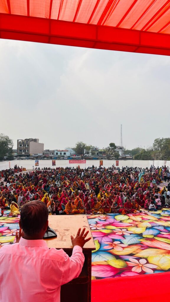 सभा स्थल पर अखंड भारत श्री राम जन्म स्थान का भव्य मंदिर दृश्य शताब्दी महापुरुषों एवं उनके विचारों से पंडाल को सजाया गया जहां पोडियम पर संत रविदास जी के 650 वे जन्म वर्ष के उपलक्ष में माघ पूर्णिमा विक्रम संवत 2082 से लेकर 2013 तक सामाजिक समरसता गतिविधि द्वारा मनाया जाने का संकल्प अंकित किया गया