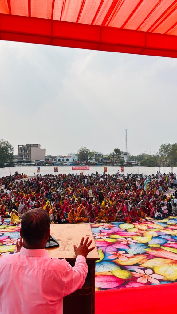 सभा स्थल पर अखंड भारत श्री राम जन्म स्थान का भव्य मंदिर दृश्य शताब्दी महापुरुषों एवं उनके विचारों से पंडाल को सजाया गया जहां पोडियम पर संत रविदास जी के 650 वे जन्म वर्ष के उपलक्ष में माघ पूर्णिमा विक्रम संवत 2082 से लेकर 2013 तक सामाजिक समरसता गतिविधि द्वारा मनाया जाने का संकल्प अंकित किया गया