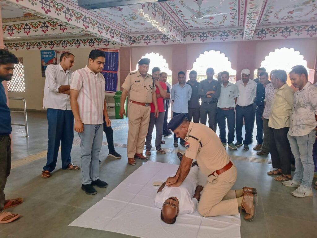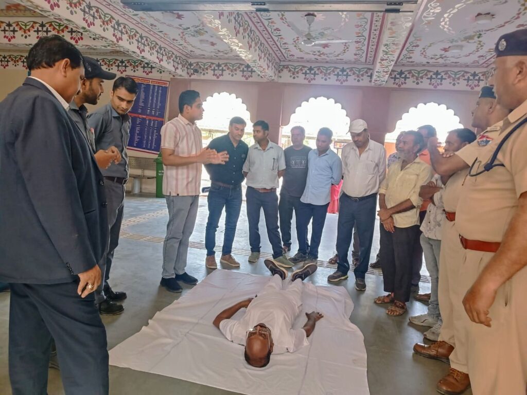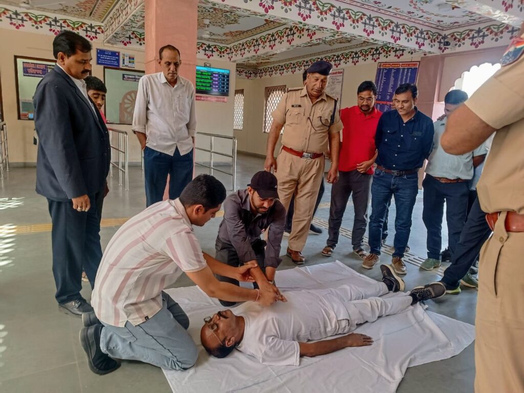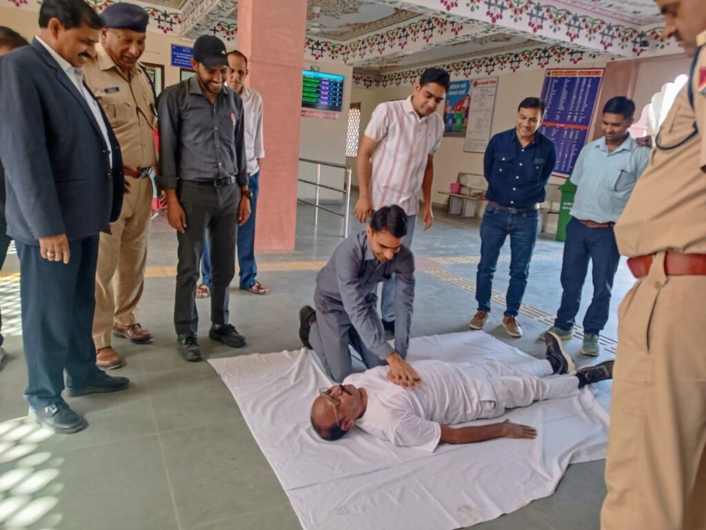 कार्यक्रम का संचालन स्वास्थ्य इकाई प्रभारी- डॉ. अंशुमान शर्मा के निर्देशन में किया गया !प्रशिक्षण में मुख्य फार्मासिस्ट- गिरिराज मीणा और मुख्य स्वास्थ्य निरीक्षक- सुशील कुमार टेलर ने RPF,लाइन रनिंग,ट्रैफिक और कमर्शियल तथा इंजीनियरिंग विभाग के कई कर्मचारियों को आपातकाल में जीवन रक्षक उपायों की जानकारी दी, इस दौरान डॉ. अंशुमान शर्मा ने सीपीआर देने की प्रक्रिया को डेमो के माध्यम से समझाया और कर्मचारियों को हेड्स ऑन प्रैक्टिस भी करवाई गई, प्रशिक्षण में कर्मचारियों को आपातकालीन परिस्थितियों में त्वरित सहायता देने की उपयोगी जानकारी दी गई इस दौरान स्टेशन अधीक्षक -सियाराम मीणा स्टेशन मास्टर- भूर सिंह मीणा रे. सु. ब.प्रभारी उप निरीक्षक- त्रिलोकचंद व ASI -मोहनलाल जाट व दिनेश चंद्र- स्वास्थ्य सहायक सहित कई वेंडर्स व यात्रीगण उपस्थित रहे !