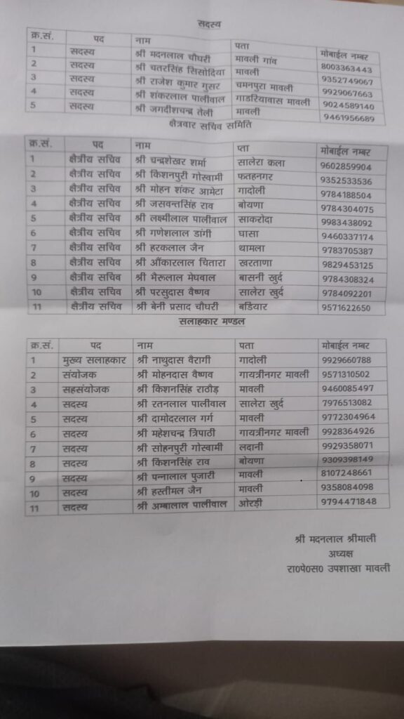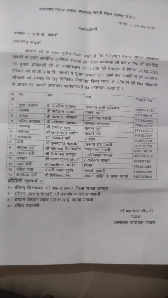 मावली में राजस्थान पेंशनर समाज के उपशाखा के अध्यक्ष ने कार्यकारणी में सदस्यों का मनोनयन किया mv24media