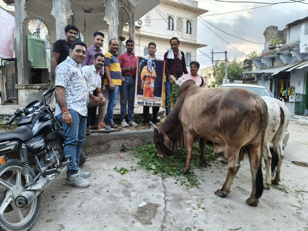 राजसमंद!प्रधानमंत्री श्री नरेंद्र मोदी जी के जन्मदिन के अवसर पर पूरे विश्व के साथ केलवा में भी घुमन्तू गौमाता को हरा चारा व गुड खिलाकर गौ सेवा की व मिठाईयां बांटकर मनाया गया जन्मदिवस इस दौरान भाजपा के वरिष्ठ शंकर लाल जी मादरेचा, राजकुमार पालीवाल (प्रियंका), मोहन लाल पालीवाल, प्रताप मंडल के पुर्व महामंत्री महेन्द्र कोठारी (एपेक्स) सुरेश सोनी, राजेन्द्र कोठरी, निर्भय नारायण पुरोहित,जितेन्द्र महात्मा,कान्ति कोठारी, मुकेश पालीवाल, धर्मचंद माली,प्रदीप पालीवाल,मदन रेगर,धर्मेश पुरोहित,चंद्र वीर सिंह, जितेन्द्र पालीवाल,कमलेश पालीवाल, विनोद पटवा, भुपेंद्र पालीवाल,कमलेश मादरेचा,रतन प्रजापत,अशोक सोनी व समस्त मोदी फैन्स ग्रुप के सदस्य उपस्थित थे। महेन्द्र कोठारी (एपेक्स) ने उद्बोधन मे कहा की सभी को मोदी जी से प्रेरणा लेकर देश सेवा हेतू हमेशा तत्पर रहना चाहिए !