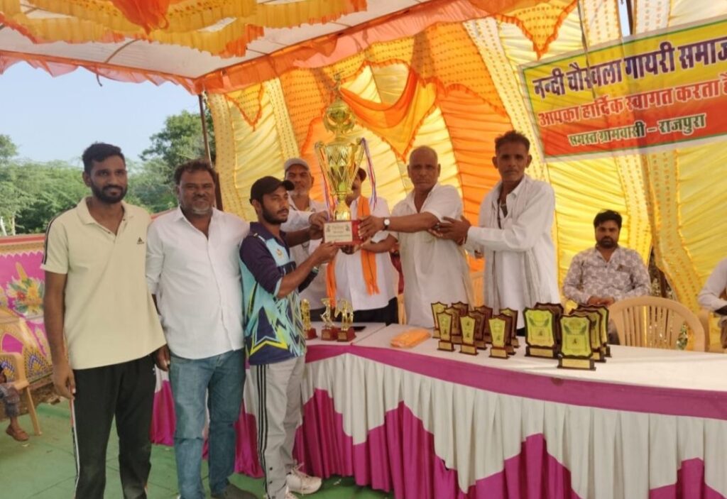 राजसमन्द! नंदी चौखला गायरी समाज की क्रिकेट प्रतियोगिता का समापन समारोह राजपुरा में आयोजित हुआ जिसमें 22 गावों के खिलाड़ियों ने हिस्सा लिया फाइनल मैच जसपुरा रॉयल्स और आनंद क्लब के बीच में हुआ इस मैच में जसपुरा रॉयल्स ने 10 विकेट से जीत दर्ज की !