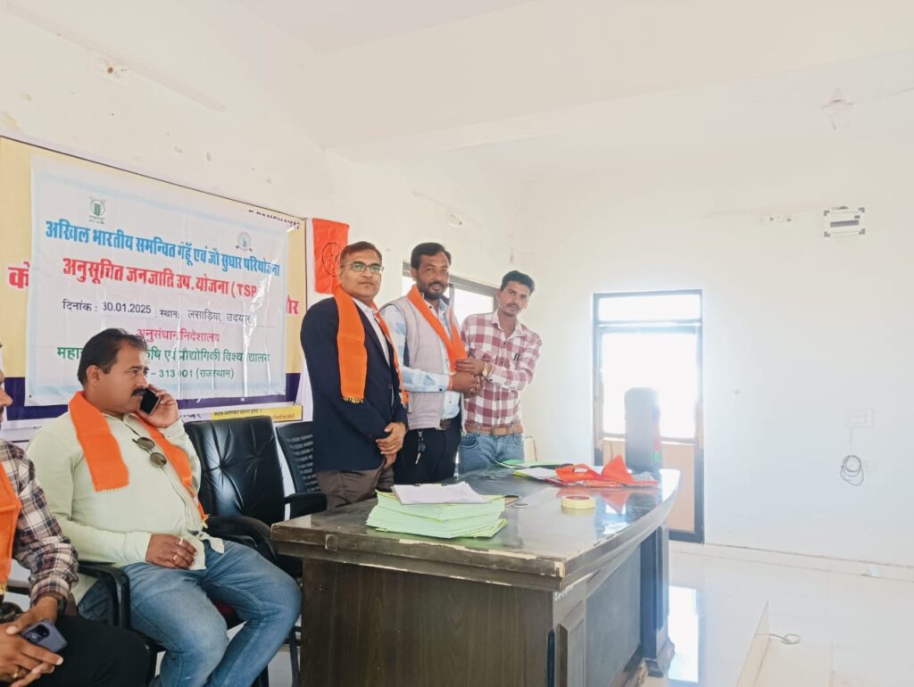 लसाडिया (नरेश कुमार वेद)! महाराणा प्रताप कृषि एवं प्रौद्योगिकी विश्वविद्यालय उदयपुर से आए वैज्ञानिक प्रोफेसर डॉक्टर जगदीश चौधरी ने गेहूं की उन्नत खेती एवं समस्त कृषक क्रियाओं के बारे में विस्तार रूप से चर्चा की और जैविक खेती वर्तमान की आवश्यकता पर शीर्षक रूप पर किसान भाइयों को जैविक खेती के उद्देश्य एवं जैविक खेती के घटक जैसे कंपोस्ट केंचुआ खाद पंचगव्य बीजाअमृत दशप्रणी इत्यादि पर किसान भाइयों को विस्तार रूप से समझाया तथा किसान भाइयों को जैविक खेती के लाभ समझाते हुए प्रेरित किया जिसमें अनुसूचित जनजाति के 110 किसानों ने भाग लिया जिसमें भारतीय किसान संघ के पदाधिकारी ने अपनी ग्राम समिति के सदस्यों को बुलाकर कार्यक्रम का पूरा प्रशिक्षण करवाया इसमें भारतीय किसान संघ सलूंबर जिला मंत्री भेरू लाल मीणा ने महाराणा कृषि विश्वविद्यालय के वैज्ञानिकों का स्वागत किया गया किसान संघ तहसील अध्यक्ष केवा राम मीणा ने सभी किसानों को धन्यवाद दिया मंच संचालन तहसील मंत्री दौलत राम मीणा ने किया जिसमें उपस्थित भारतीय किसान संघ जिला मंत्री भेरू लाल मीणा गोपालपुरा,प्रोफेसर डॉ अमित कुमार डॉ पीयूष चौधरी तहसील अध्यक्ष केवा राम मीणा देवलिया, तहसील मंत्री दौलत राम मीणा टटाकिया, तहसील सह मंत्री शांतिलाल मीणा, प्रचार प्रमुख शंकर लाल मीणा, बीज प्रमुख नानालाल गुर्जर,राजस्व प्रमुख शंकर लाल मीणा,सहकारिता प्रमुख पूंजीलाल मीणा,पूर्व सरपंच धनराज मीणा, अर्जुन मीणा देवलिया, दिनेश चौधरी,आदि ग्राम समिति अध्यक्ष मंत्री व कार्यकारी सदस्य उपस्थित रहे।
