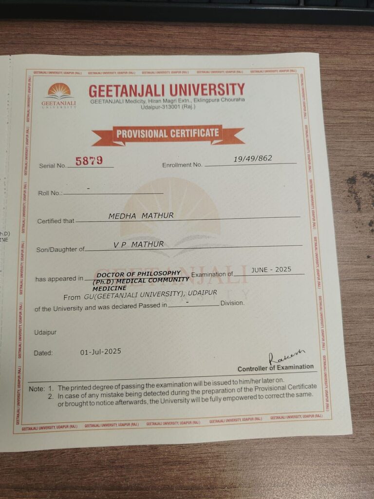 उदयपुर (नरेन्द्र त्रिपाठी)!गीतांजलि मेडिकल कॉलेज एवं हॉस्पिटल के कम्युनिटी मेडिसिन विभाग की प्रोफेसर डॉ. मेधा माथुर को गीतांजलि विश्वविद्यालय, उदयपुर द्वारा डॉक्टर ऑफ फिलॉसफी (पी.एच.डी.) की उपाधि प्रदान की गई है।