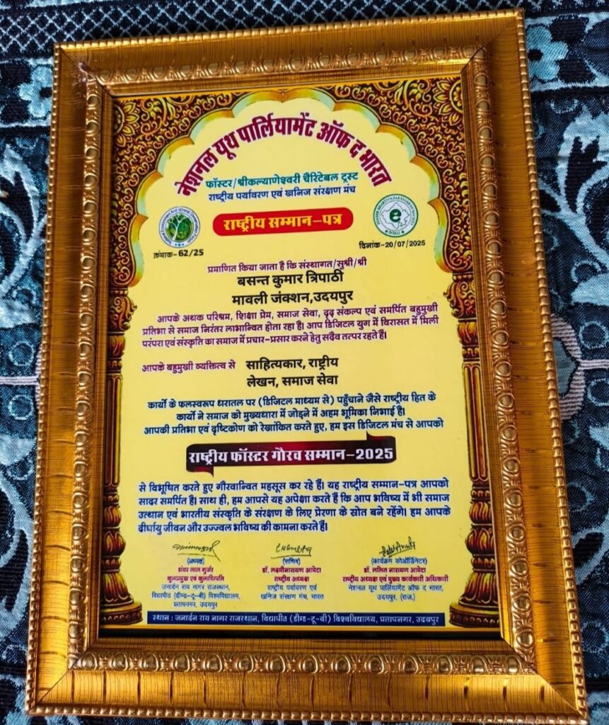 मावली ( नरेन्द्र त्रिपाठी)!मावली नगर के प्रबुद्ध शिक्षाविद , साहित्यकार ,राजनीतिज्ञ एवम समजसेवी बसंत कुमार त्रिपाठी को गत दिनों जनार्दन राय नागर विश्व विद्यालय उदयपुर के सभागार मे राष्ट्रीय फॉस्टर गौरव सम्मान सेसम्मानित किया गया। श्री त्रिपाठी को शिक्षा ,साहित्य ,समाजसेवा ,पर्यावरण संरक्षण ,एवम भारतीय संस्कृति को बढ़ावा देने पर सम्मानित किया गया।