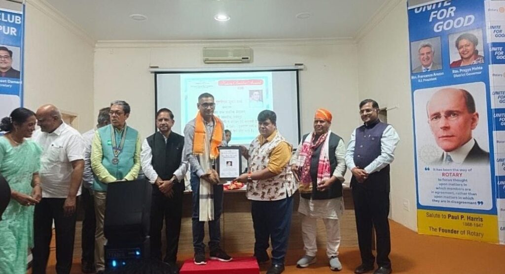 उदयपुर, (नरेन्द्र त्रिपाठी)!शिक्षक दिवस के पावन अवसर पर मावली ब्लाक के राजकीय उच्च प्राथमिक विद्यालय भावली के शिक्षक व रा.शि.संघ राष्ट्रीय के उपाध्यक्ष श्री पुरूषोत्तम कुमार शर्मा को विभिन्न सामाजिक कार्यों व गत वर्षों में विभिन्न उल्लेखनीय सेवा कार्यों के लिए प्रतिष्ठित रोटरी क्लब उदयपुर द्वारा राज्य सभा सांसद श्री चुन्नीलाल जी गरासिया व नगर उपमहापौर श्री पारस सिंघवी तथा रोटरी क्लब के अध्यक्ष श्री दीपक मेहता के कर कमलों से **नेशन बिल्डर्स अवार्ड** से सम्मानित किया गया! शर्मा के विभिन्न विद्यालयों में पदस्थापित रहते हुए विभिन्न शैक्षणिक उपलब्धियां, सामाजिक सुधारों के कार्य तथा विभिन्न जन सेवा के कार्यों के निर्वहन के कारण पूर्व में भी श्री शर्मा को उदयपुर के विभिन्न प्रतिष्ठित संस्थानों द्वारा कई बार सम्मानित किया जा चुका है..शर्मा ने बताया कि नर सेवा ही नारायण सेवा.को मानकर किए सद्कार्यों के फलस्वरूप ही विभिन्न सम्मान प्राप्त करने का सौभाग्य प्राप्त हुआ.तथा रोटरी क्लब के पदाधिकारियों के प्रति आभार व्यक्त किया!