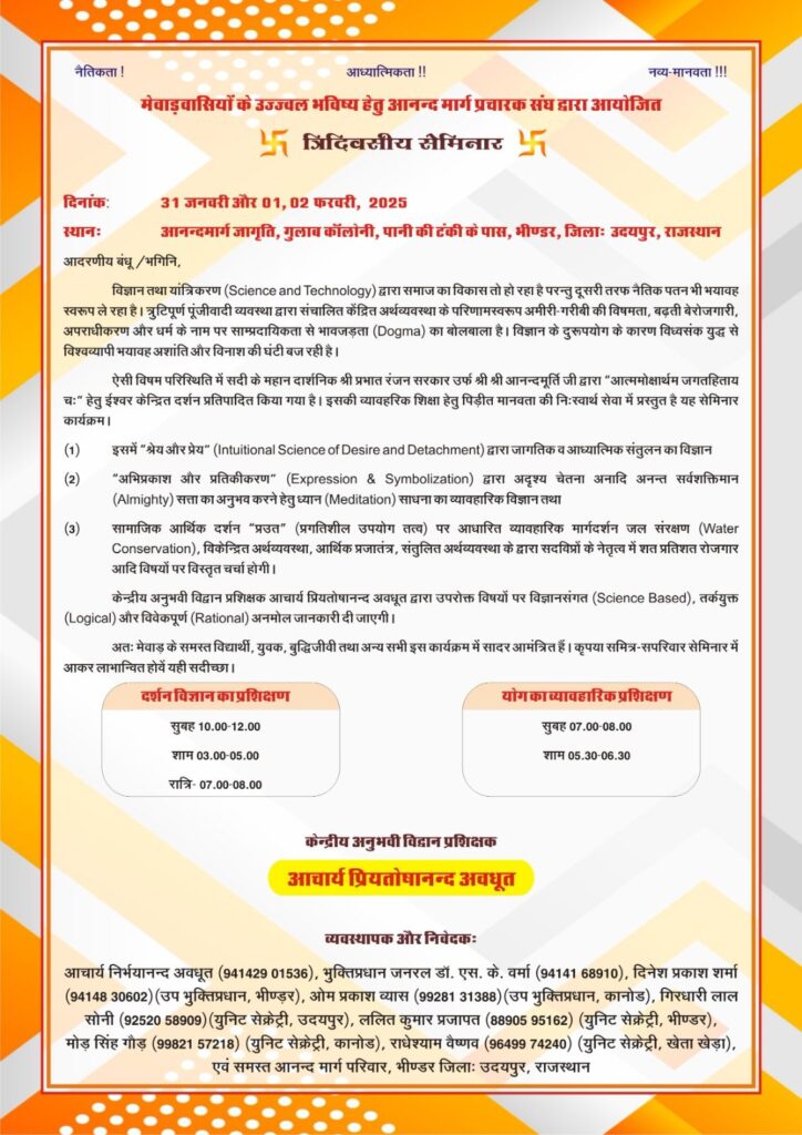 भींडर, विश्व व्यापी आध्यात्मिक सामाजिक संस्था आनंद मार्ग भींडर नगर में प्रांतिय योग साधना शिविर (सेमिनार) स्तरीय निःशुल्क आयोजन आनंद मार्ग जागृति परिसर भींडर में आयोजित किया जा रहा हैं।