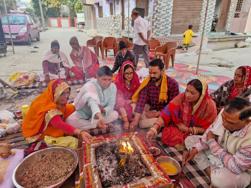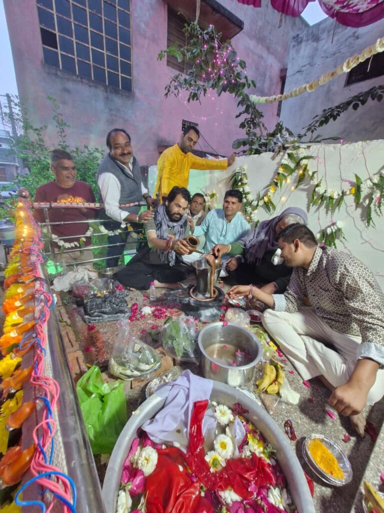 मावली (नरेन्द्र त्रिपाठी), 26 फरवरी। उपखण्ड मुख्यालय की पंचायत समिति के पीछे बुधवार को महाशिवरात्रि के पावन पर्व पर शिवलिंग सहित शिव परिवार की प्राण प्रतिष्ठा की गई जिसके बाद श्रद्धालू भाव विभोर होकर खूब थिरके वंही पूर्व संध्या पर कीर्तन का भी आयोजन किया गया था जिसमे श्रद्धालू खूब झूमें । अटल सेवा केंद्र के समीप नव निर्मित शिव मंदिर की प्राण प्रतिष्ठा कार्यक्रम के तहत मंगलवार को पूर्व संध्या पर रात्रि जागरण करते हुए रूद्र पाठ,कीर्तन एवं भजन संध्या का आयोजन किया गया जिसमे बड़ी संख्या में महिला-पुरुषो तथा आबाल वृद्धधों ने भाग लिया और सुबह तक खूब झूमें। बुधवार सुबह सवा पांच बजे निर्धारित मुहूर्त के अनुसार शिवलिंग के साथ ही माता पार्वती, प्रभु गणेश व प्रभु कार्तिकेय तथा नंदी महाराज व लक्ष्मी के प्रतीक कछुवे की पं. जगदीश चंद्र आमेटा, पं. राधेश्याम जोशी, पं. कमलेश त्रिपाठी व पं. गौरव श्रीमाली के निर्देशन में वैदिक मन्त्रोंचार के साथ विधिवत प्राण प्रतिष्ठा की गई। साढ़े छह बजे से हवन प्रारम्भ हुआ जो प्रातः 10 बजे महाआरती एवं प्रसाद वितरण के साथ संपन्न हुआ। प्राण प्रतिष्ठा कार्यक्रम के बाद श्रद्धालू महिलाएं भाव विभोर होकर खूब नाची।