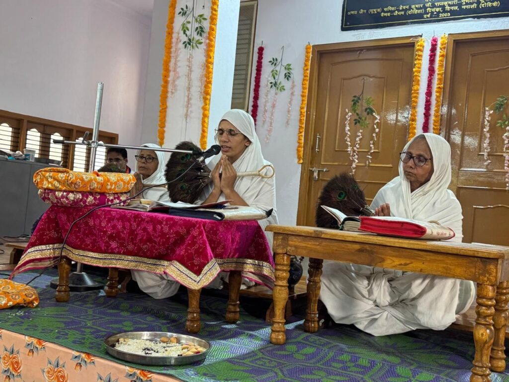 समाज के उपाध्यक्ष विपिन बखरिया ने बताया कि चातुर्मास कमेटी के अध्यक्ष नरेन्द्र पंचोली के नेतृत्व में समाजजन खेरवाड़ा की सीमा संस्कृत स्कूल पहुंचे जहां से आर्यिका संघ को निमंत्रण के साथ महावीर नगर के शांतिनाथ जिनालय तथा स्वस्तिक कॉलोनी में आदिनाथ मंदिर ले जाया गया। शाह जी के कोठे पर महिला जैन बैंड की मधुर धुन,पुरुषों ने ग्यारह गन्ने की सेल दी वहीं महिलाओं ने ग्यारह मंगल कलश के साथ मंगल गान किया। यहां से पुराने बस स्टैंड पर 31 जोड़ो द्वारा माताजी का पाद प्रक्षालन कर आरती उतारी गई। पुरानी सब्जी मंडी में जुलूस के पहुंचने पर ड्रोन से पूरे रस्ते गुलाब की पंखुड़ियों से पुष्प वर्षा की गई तथा महिला मंच द्वारा सुंदर नृत्य प्रस्तुत किया गया।