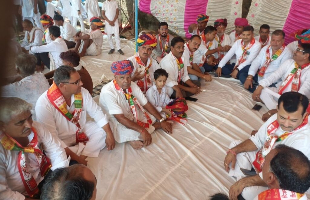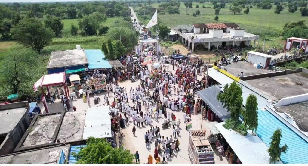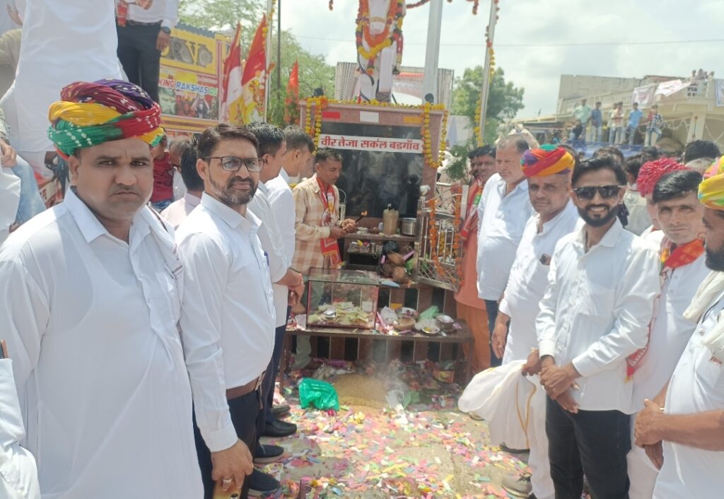 मावली (नरेन्द्र त्रिपाठी)!बड़गांव गांव के मुख्य चौराहे बड़गांव कांटा पर तेजा दशमी के अवसर पर वीर तेजाजी महाराज के स्थान पर आसपास के गांव से आए समाज जन वह भक्तगणों का जमावड़ा लग गया तेजा दशमी की रैली में आए व्यक्ति अपने साथ ट्रैक्टर वह फोर व्हीलर में आए मोटरसाइकिल पर अपनी पारंपरिक वेशभूषा धोती कुर्ता और साफा बांधकर माताएं बहने पैदल गीत गाती हुई डीजे पर नाचती हुई तेजाजी महाराज के जयकारे लगाते हुए बड़गांव उदा खेड़ा मन्ना खेड़ा छपरा अघोरिया आदि गांव से आये बड़गांव वासियों ने 15 दिन की मेहनत से आसपास के गांव में निमंत्रण पत्र देकर चौराहे के चारों ओर स्वागत द्वार लगवाएं आकर्षक रंग बिरंगी रोशनी से सजाया इस दौरान मावली विधानसभा प्रभारी प्रत्याशी कृष्ण गोपाल पालीवाल रोशन लाल सुथार कैलाश चंद्र गाडरी जीवन सिंह राव मधुसूदन पारीक मोहनलाल जाट नए कार्यक्रम में शिरकत की वही मावली विधायक पुष्कर लाल डांगी मोहनलाल जाट भी कार्यक्रम में पहुंचे बड़गांव में तेजाजी के स्थान पर गत वर्ष सांसद चंद्रप्रकाश जोशी के द्वारा मास्क लाइट लगाने की घोषणा की थी वह लाइट लगने पर ग्राम वासियों व समाज जनों ने हर्ष व्यक्त किया 31 फीट ऊंची लाइट जिस पर 6 मास्क लाइटें लगी हुई है कार्यक्रम को भव्य व आकर्षक बनाने के लिए बड़ागांव के प्रत्येक व्यक्ति ने अपना पूर्ण सहयोग दिया युवाओं में जोश देखने योग्यता भाई आतिशबाजी के मध्य ट्रैक्टर करतब आकर्षण का केंद्र रहे रैली में आए 11 घोड़े ने भी अपने करतब बताएं समाज की ओर से उनको भी मोमेंटो देकर सम्मानित किया बाद में महाप्रसादी का आयोजन किया गया इस नजारे को देखने के लिए आसपास के गांव से भी बड़ी संख्या में स्त्री पुरुष उपस्थित थे!