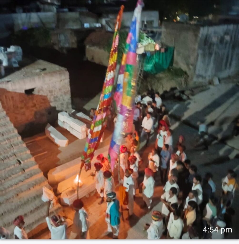 भीलवाड़ा(जय प्रकाश शर्मा)!बनेड़ा श्री गौ भक्त वीर तेजाजी महाराज के मैले के अवसर पर शुक्रवार को राक्षी गांव में मशक बेंड के साथ ध्वज की शौभायात्रा निकालने के पश्चात चारभुजा मंदिर चौक में ध्वज स्थापित किया।