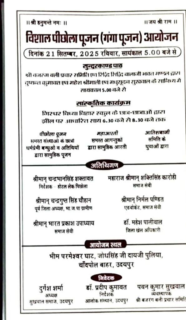 उदयपुर, (नरेन्द्र त्रिपाठी)। बजरंग बली प्रचार समिति द्वारा सर्वपितृ अमावस्या के अवसर पर विशाल पिछोला जल पूजन एवं गंगा आरती का आयोजन 21 सितम्बर, रविवार को शाम 5 बजे से भीम परमेश्वर घाट, जोधासिंह जी दायाजी पुलिया, चाँदपोल बाहर स्थित पिछोला झील पर होगा।