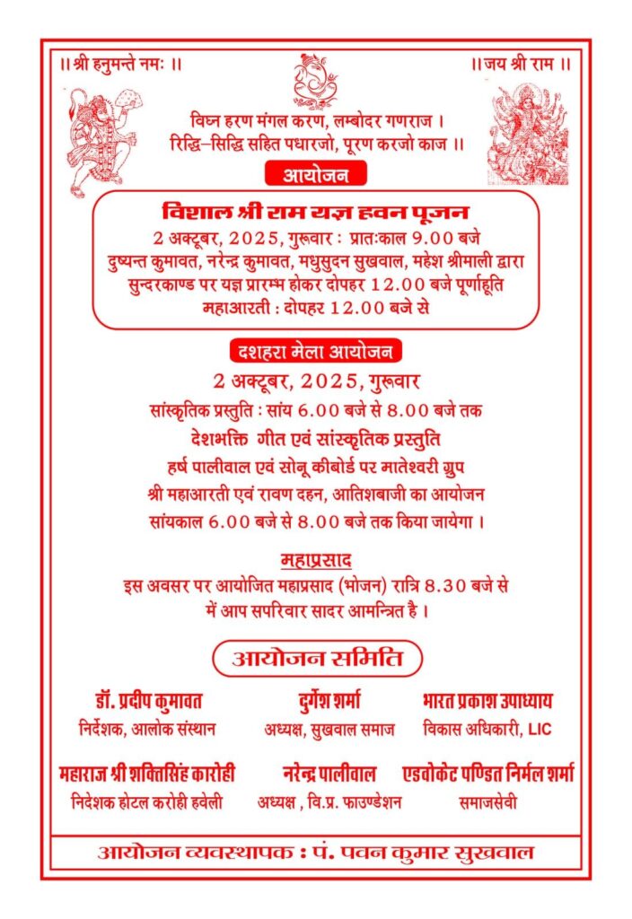 आयोजन में डॉ. प्रदीप कुमावत, महाराज शक्ति सिंह कारोही, नरेंद्र पालीवाल (विप्र फाउंडेशन), एडवोकेट निर्मल पंडित, दुर्गेश शर्मा, भारत प्रकाश उपाध्याय सहित क्षेत्रवासी, गणमान्य नागरिक, जनप्रतिनिधि एवं समिति सदस्य उपस्थित रहेंगे।
