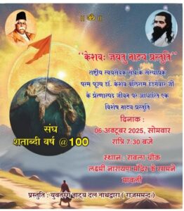 मावली (नरेन्द्र त्रिपाठी)!संघ अपना शताब्दी वर्ष विभिन्न प्रकार के कार्यक्रमों के माध्यम से मना रहा है. इनमे से एक विशेष आकर्षित और प्रेरणा देने वाली नाटिका केशव जयतु युतरंग नाट्य दल नाथद्वारा के द्वारा मावली रावला चौक में रात्रि 7.30 बजे आयोजित की जायेगी , नाटिका में डॉ. हेडगेवार जी के बाल जीवन से लेकर स्वतंत्रता संग्राम में संघ की भूमिका जैसे प्रेरणा देने वाले प्रसंगो का मंचन किया जायेगा !कार्यक्रम में समाज के प्रबुद्धजन, सामाजिक संगठनों के पदाधिकारियों और पूज्य संतो की उपस्थिति रहेगी!