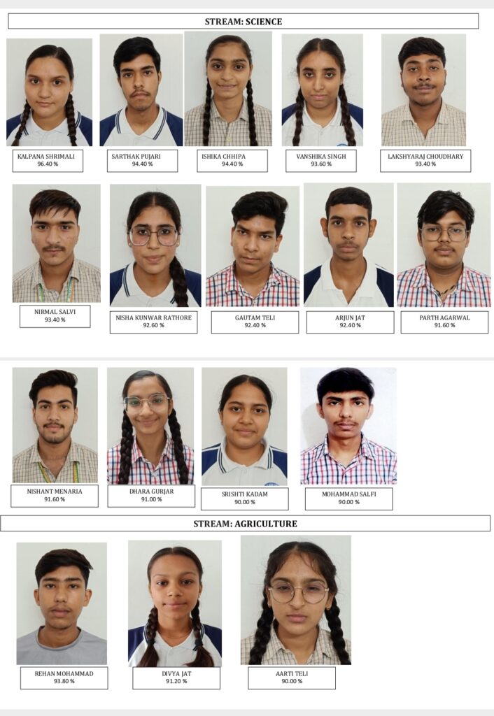 कल्पना श्रीमाली विज्ञान वर्ग में 96.40 मावली तहसील टॉपर, सार्थक पुजारी 94.40, इशिका छिपा 94.40, वंशिका सिंह 93.60 लक्ष्यराज चौधरी 93.40 ,निर्मल सालवी 93.40, निशा कुंवर राठौर 92.60, गौतम तेली 92.40, अर्जुन जाट 92.40, निशांत मेनारिया 91.60, पार्थ अग्रवाल 91.60, धरा गुर्जर 91, मोहम्मद सालिफ 90%, सृष्टि कदम 90% ।