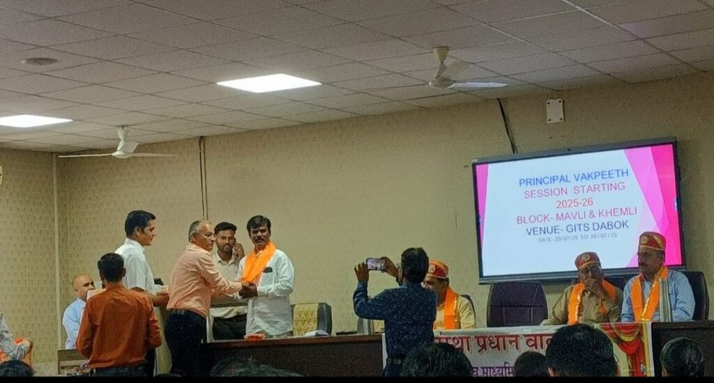 मावली (नरेन्द्र त्रिपाठी)!मावली एवं खेमली ब्लाॅक के राजकीय उच्च माध्यमिक विद्यालयों के प्राचार्यों की उक्त वाक्पीठ के अंतिम दिन आज प्रातःकालीन सत्र में गायत्री शक्तिपीठ के संभाग संयोजक अर्जुन सनाढ्य ने वार्ता के जरिए बताया कि शिक्षक बच्चों के भविष्य का निर्माता है। समय का सदुपयोग करें तथा बच्चों को कुछ प्रदान करें। बच्चों को संस्कारित करने में हम कोई कसर नहीं रखें। सनातन संस्कृति को आगे बढ़ाने में अपनी भागीदारी निभाएं। विद्यार्थियों को भारतीय संस्कृति ज्ञान परीक्षा के लिए प्रेरित करें ताकि वह भारतीय संस्कृति से रूबरू हो सके। उन्होने बताया कि इस परीक्षा में 56 हजार बच्चों ने भाग लिया जिससे उदयपुर जिले का भारत भर में चतुर्थ स्थान रहा। इसी प्रकार से डाॅ.यशवंत आमेटा ने अहिंसात्मक संप्रेषण एवं सुगमकर्ता शिक्षक विषयक वार्ता प्रस्तुत की तथा बताया कि इससे हमारे जीवन में सकारात्मक परिणाम सामने आते हैं। हिन्दुस्थान स्काउट गाइड के संभागीय कमिश्नर गोपाल मेहता मेनारिया ने स्काउटिंग गतिविधियों की जानकारी से अवगत कराते हुए बच्चों को इससे लाभान्वित करते हुए हर जगह स्वयंसेवक के रूप में बालक-बालिकाओं को तैयार करने का आह्वान किया। रेसा पी के जिलाध्यक्ष मनीष सोनी ने भी वार्ता प्रस्तुत की। वाक्पीठ समापन समारोह के मुख्य अतिथि देहात जिला कांग्रेस कमेटी के जिला महासचिव श्यामलाल आमेटा,प्रगतिशील शिक्षक संघ के प्रदेश सभाध्यक्ष धुलीराम डांगी,अतिरिक्त ब्लाॅक शिक्षा अधिकारी प्रकाशचन्द्र चैधरी,आरपी पंकज जोशी आदि ने भी विचार व्यक्त किए। समापन कार्यक्रम की अध्यक्षता करते हुए मुख्य ब्लाॅक शिक्षा अधिकारी प्रमोद कुमार सुथार ने वाक्पीठ कार्यक्रम में मौजूद सभी प्राचार्यों से जर्जर भवनों की जानकारी मय एसडीएमसी प्रस्ताव एवं फोटो के सोमवार तक सीबीईओ कार्यालय भिजवाने को कहा ताकि जर्जर भवनों की जानकारी से आगे अवगत कराकर अग्रिम कार्यवाही की जा सके। संस्था प्रधानों ने इंजीनियर के जरिए अवलोकन करवाकर जर्जर भवनों को चिन्हित किए जाने का आग्रह किया। राजस्थान अम्बेडकर शिक्षक संघ के प्रदेश अध्यक्ष खेमराज कड़ेला, राजस्थान शिक्षक संघ (अंबेडकर ) सरंक्षक पूर्व प्रदेश महामंत्री सुरेश कुमार देशबंधु,वाक्पीठ की पूर्व सभापति आशा सोनी आदि मंचासीन अतिथि थे। समापन अवसर पर बोर्ड परीक्षाओं में श्रेष्ठ अंक प्राप्त करने वाले प्रतिभावान बच्चों को सम्मानित किया गया। इन बच्चों के अभिभावकों को भी सम्मानित किया गया। बच्चों ने अपने विचार भी व्यक्त करते हुए अपनी सफलता के पीछे की पृष्ठभूमि को बयां किया। कार्यक्रम का संचालन सभाध्यक्ष मोहनलाल स्वर्णकार ने किया जबकि अतिथि स्वागत वाक्पीठ अध्यक्ष उमे